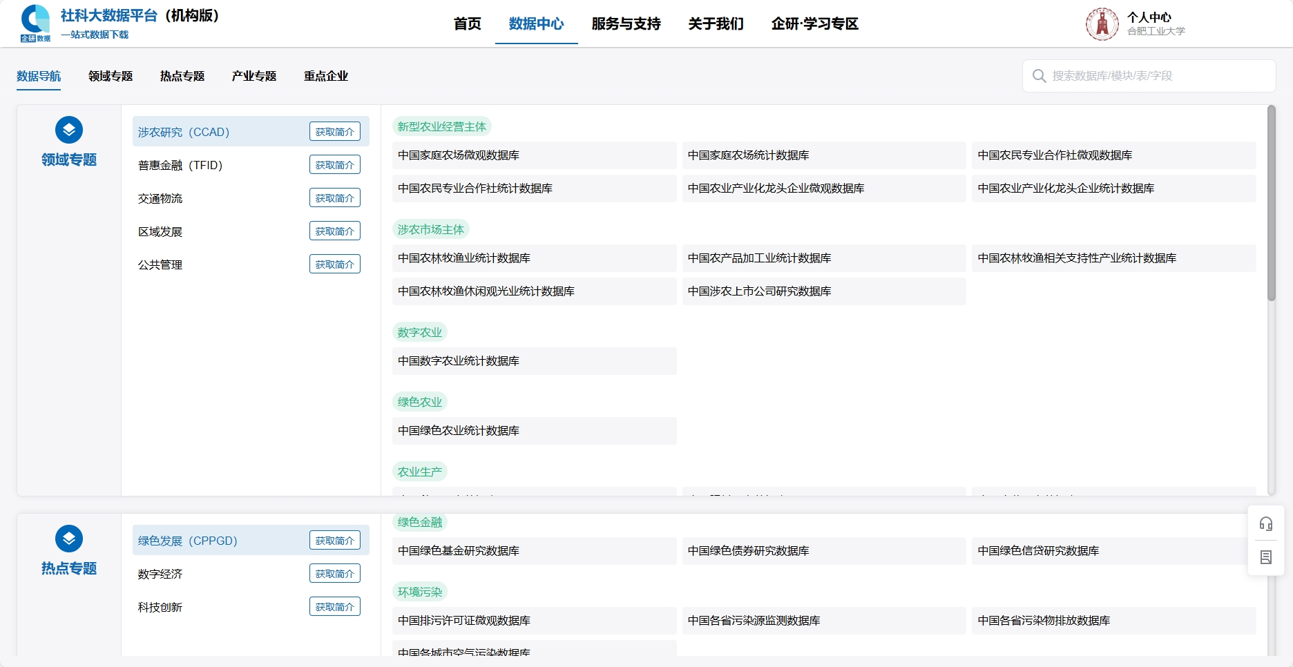 3. 在导航栏选择需要的专题数据库→数据表→筛选字段等信息→预览数据或下载。