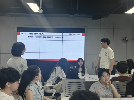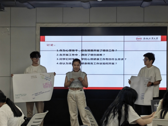 培训中,但泱泱老师首先组织心理骨干围绕心理骨干的工作职责、老员工对心理健康工作的需求进行分组讨论,同学们通过小组讨论、总结发言,分享了班级心理健康工作开展的情况、遇到的困难,以及同学们对心理健康工作的需求,经过充分讨论,但泱泱老师进一步明确了心理骨干的工作职责,强调了构建“公司、院系、班级、宿舍”四级预警防控体系的重要意义。