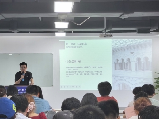 会上,张毅璞记者向同学们讲授了新闻的主要文体和内容结构,指导同学们如何找好新闻选题角度,结合具体案例阐述新闻的叙事逻辑和标准行文,最后结合每个立项团队的实践主题给予针对性选题和写作指导。