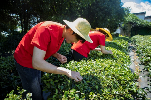 随后,团队成员在经理的带领下前往茶园体验茶叶采摘。挎着小竹篓,在千亩茶园间,团队成员在工作人员的指导下采摘茶叶,沉浸式感受多位一体的茶文化。采摘结束后,团队在园区的非遗制茶坊内,观看非遗技师熟练进行杀青、散热、揉捻、烘干……道道工序见证一篮鲜叶如何成为一杯好茶。