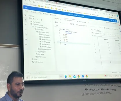 在这门课程中,我们主要学习的是数据分析工具——数据分析系统(Statistical Analysis System)。任课老师Hassan Musafer对待教学极为负责与严谨,不论是上课还是答疑,总是细致认真、耐心指导。同时,这门课的课程设计和进度安排很合理,初学者也不会太吃力。每周6个小时的课程加上难度适中的作业能够保证学习内容的有效推进。课程从最基础的数据输入,到数据分类、数据排序和数据计算,环环相扣。每节课都会学习新的代码和指令,同时又会温习上一节课的知识点,帮助我们加深记忆、巩固知识。