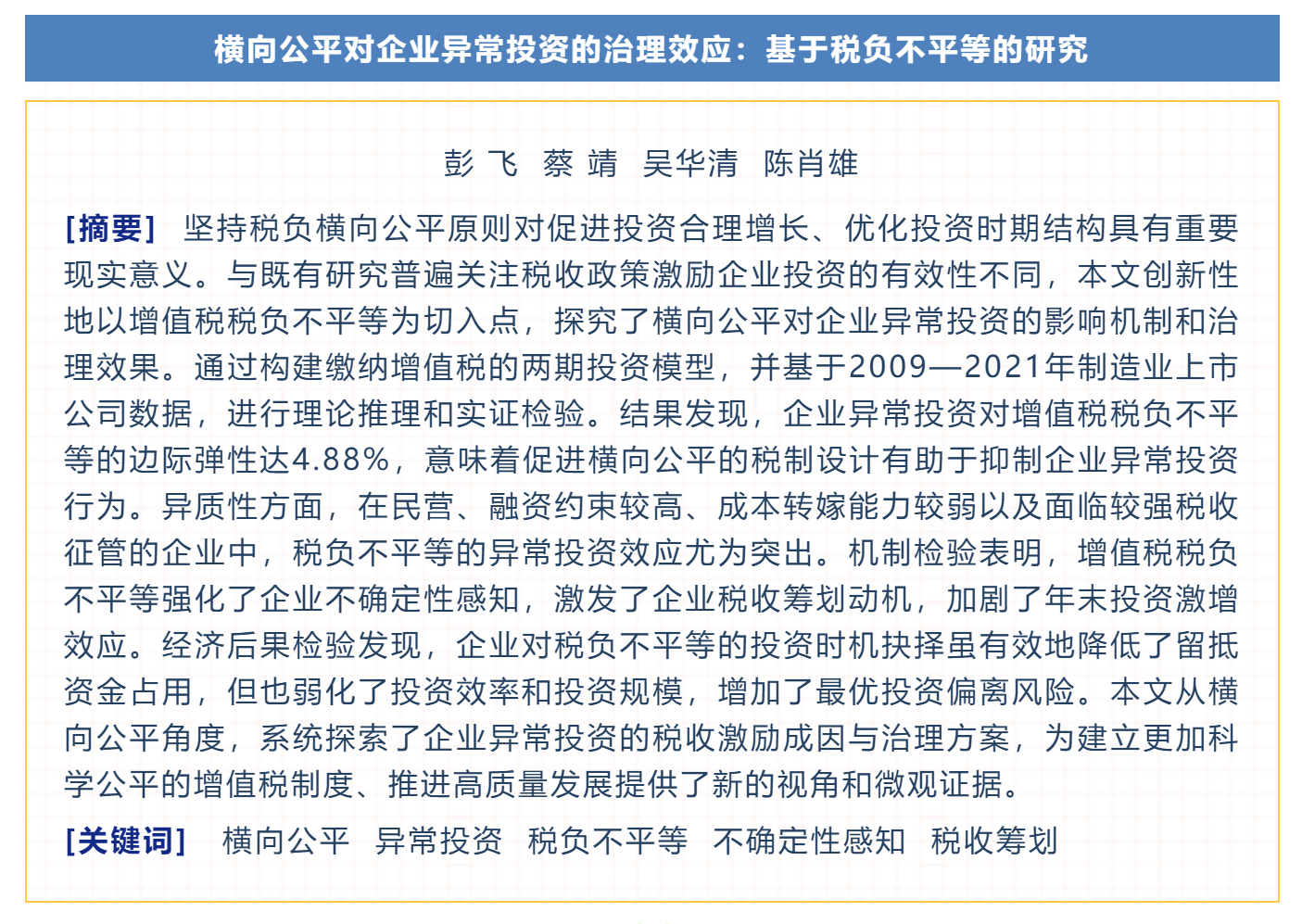近日,公司彭飞老师和吴华清老师论文《横向公平对企业异常投资的治理效应:基于税负不平等的研究》在《中国工业经济》2024年第7期发表(合作者:蔡靖、吴华清、陈肖雄)。本论文得到国家自然科学基金面上项目“财政压力约束与制造业绿色转型:机制识别与效应评估”(批准号72273038)和国家社会科学基金重大项目“新时代背景下我国经济发展质量动态评价及其政策协同研究”(批准号18ZDA064)的资助。《中国工业经济》由中国社会科公司工业经济研究所主办,是应用经济学和管理学类综合性权威理论刊物,重点覆盖国民经济、产业经济、工商管理、案例研究等学科领域,2023年的复合影响因子为24.929。