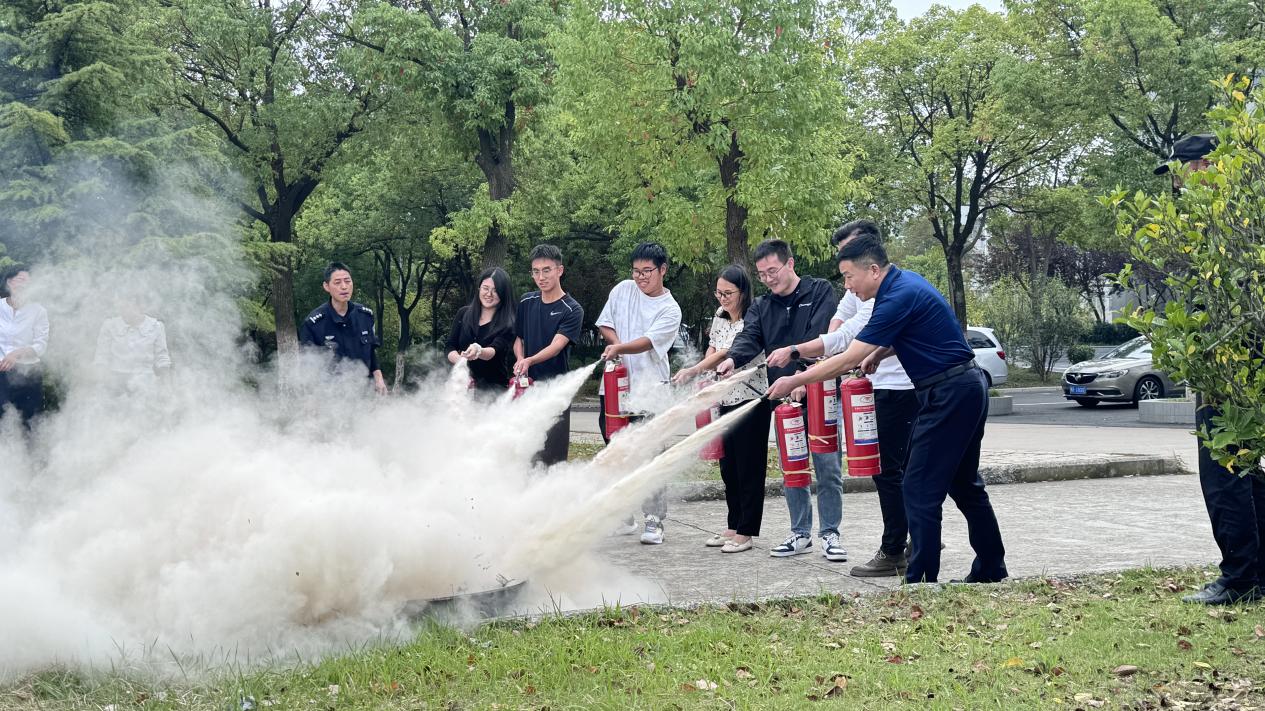 培训讲座过后,庞老师带领全体参会人员在科教楼前广场进行了使用灭火器灭火实操演练,并对演练人员的现场操作进行指导。