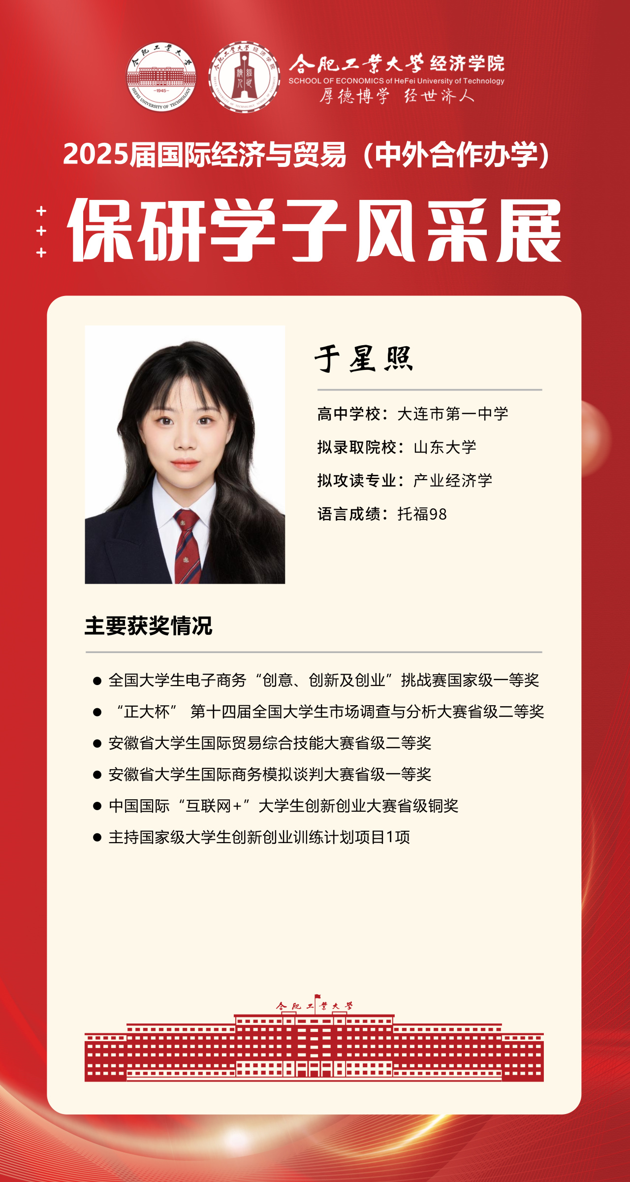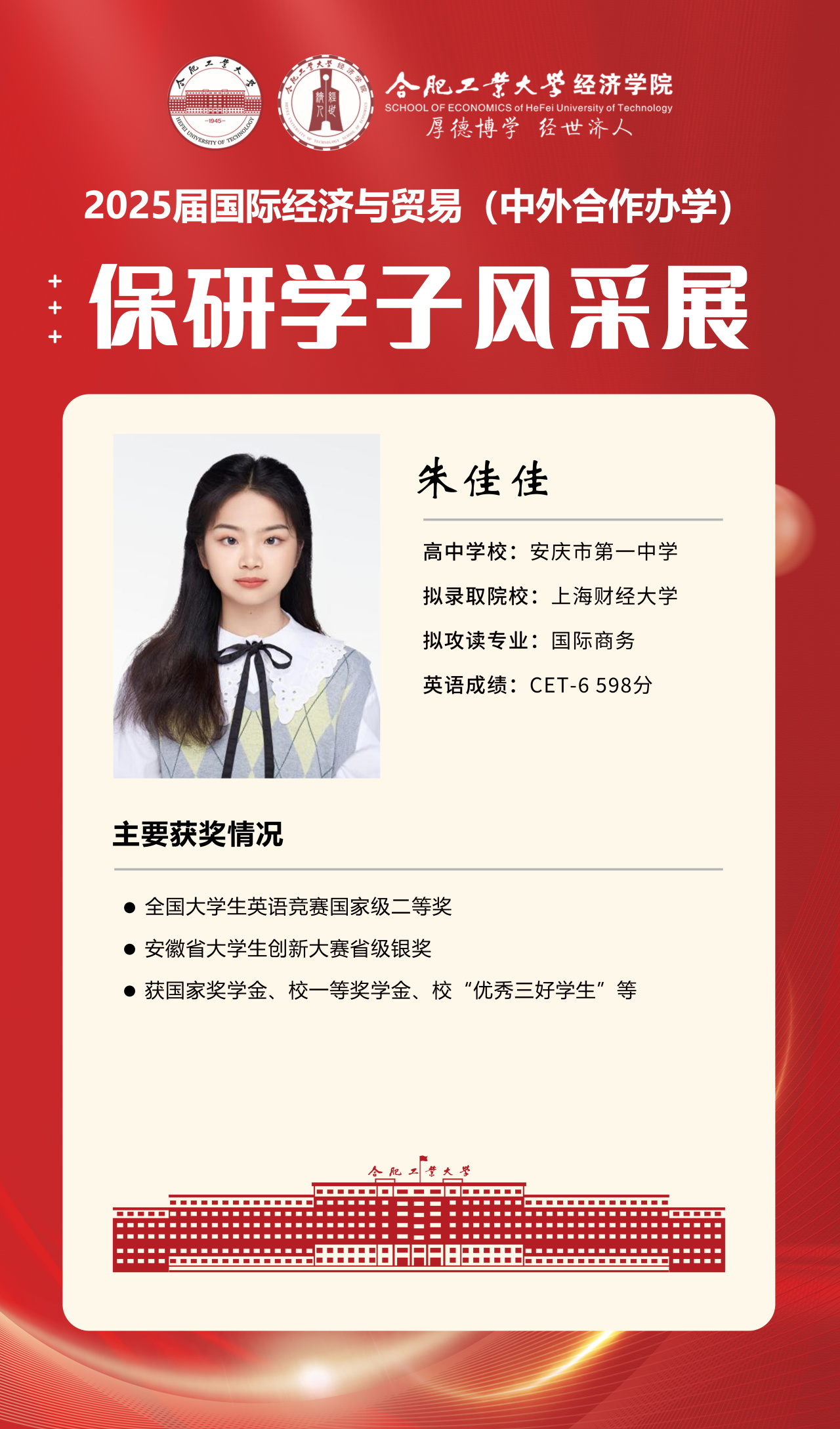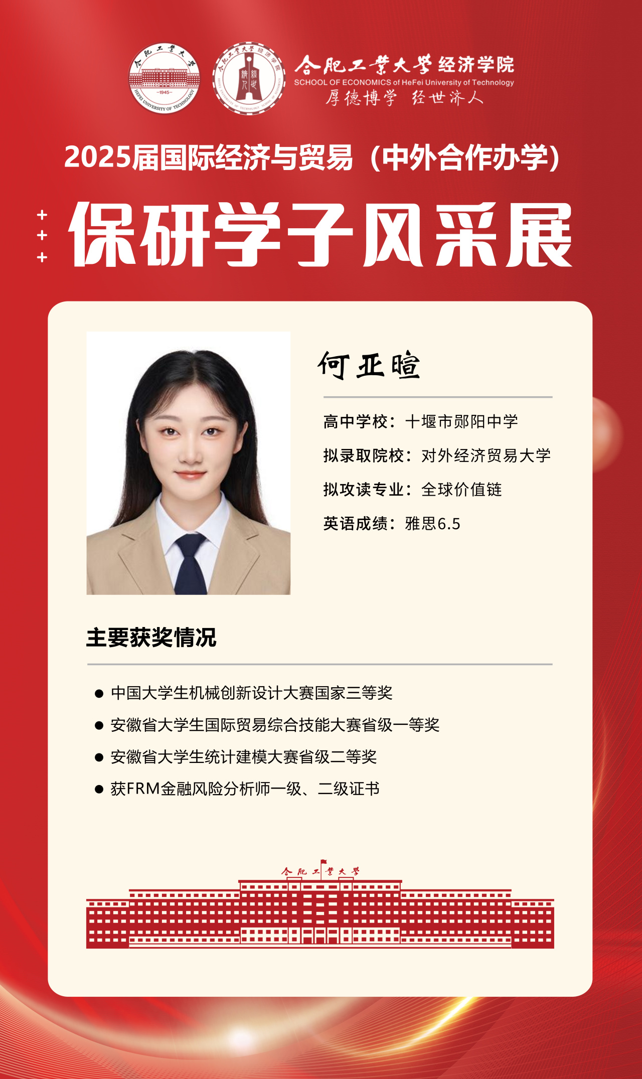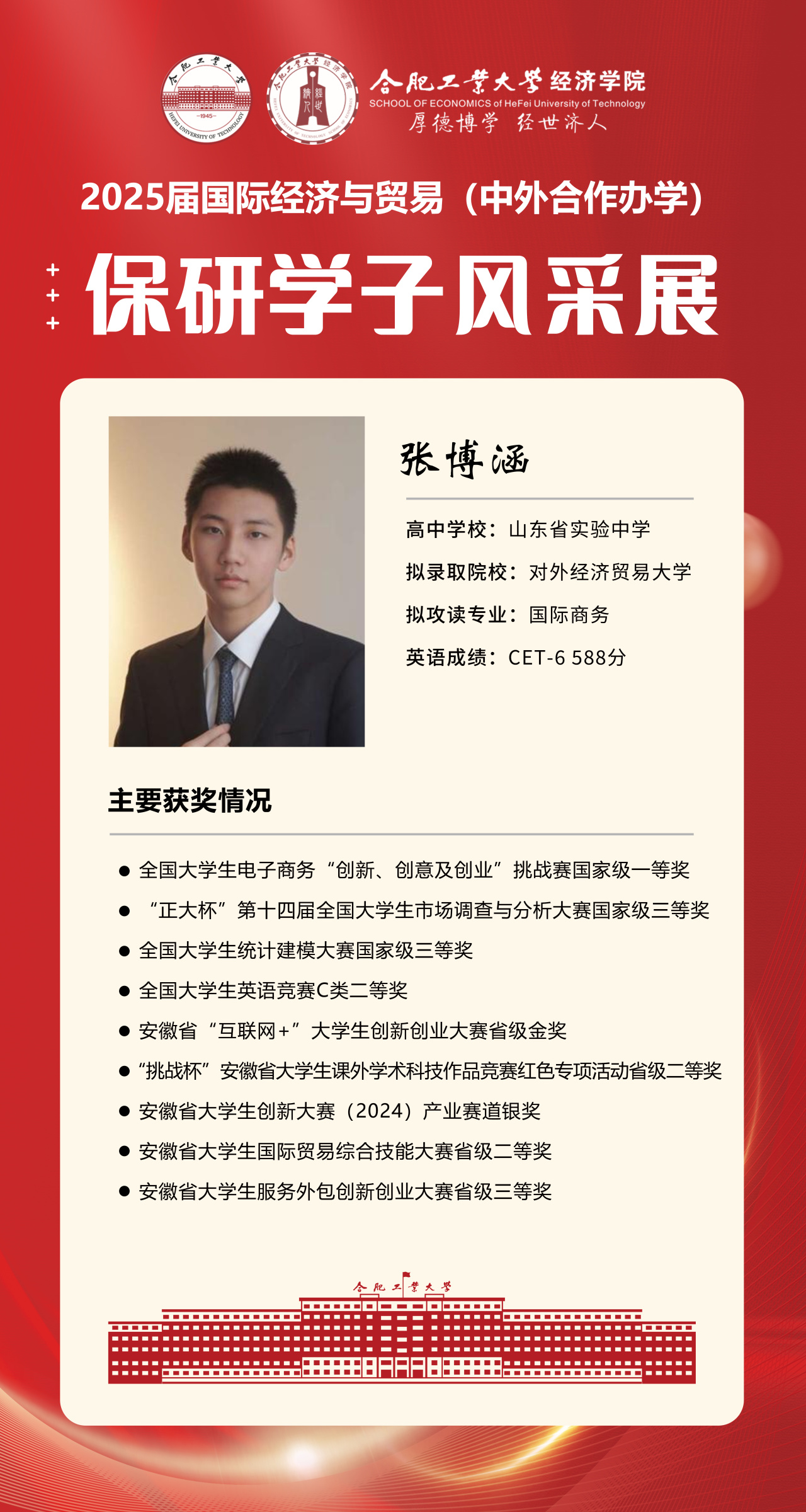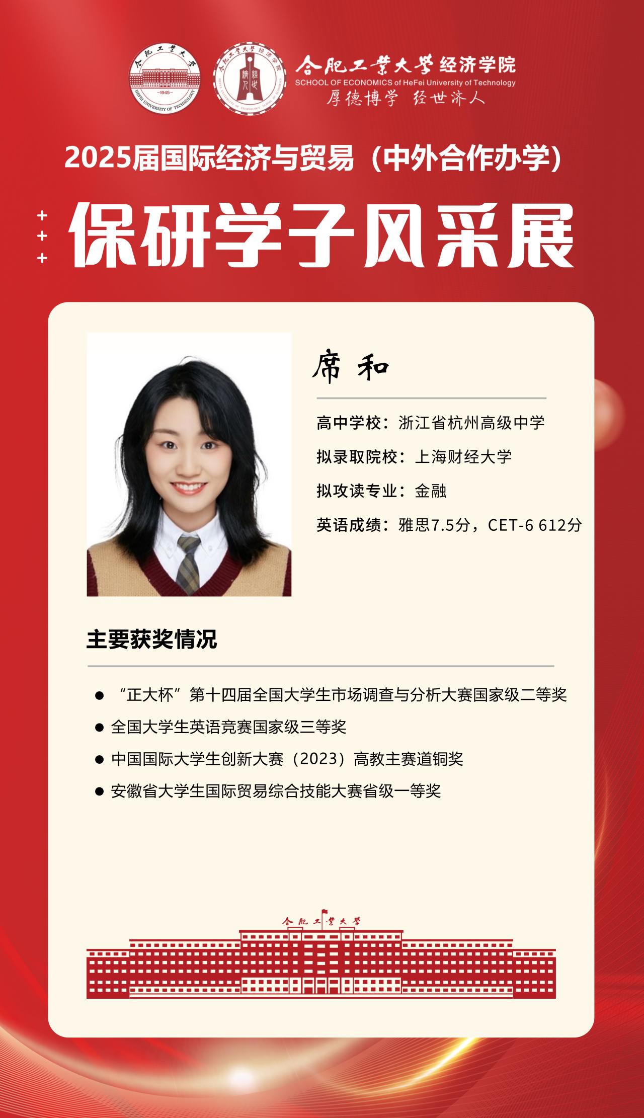 2025届beet365官方网站国际经济与贸易(中外合作办学)15名优秀推免生全部成功推免至中国科学技术大学、上海财经大学、对外经济贸易大学等“双一流”名校继续深造,充分展现了“强语言、精专业、通规则、能跨界”的培养特色。下面我们一起来看看推免学子的风采吧!
