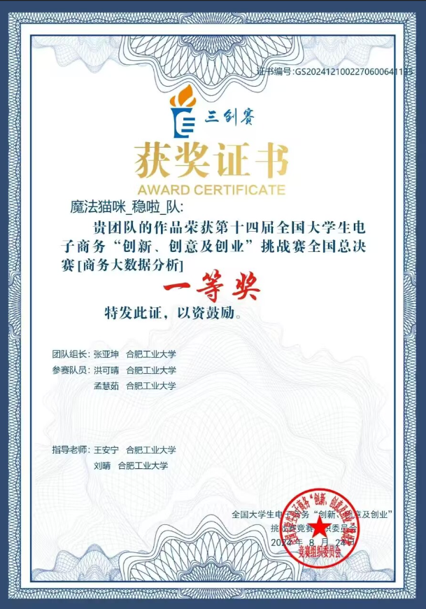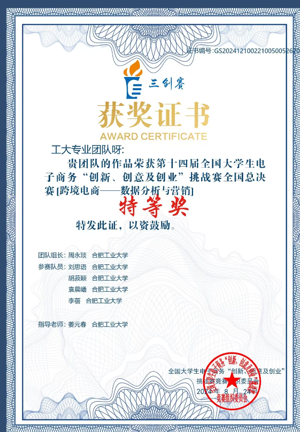 日前,第十四届全国老员工电子商务“创新、创意及创业”挑战赛(以下简称“三创赛”)落下帷幕。公司学子取得可喜成绩,袁晨曦参与的 “工大专业团队呀”团队的参赛作品《女装品类评论数据的细粒度情感分析与数字营销实践》在跨境电商数据分析与营销实战赛中荣获特等奖,宋士哲领衔的“光欢乐社团队”的参赛作品《茶物荟萃——让东方茶韵扬帆出海》在跨境电商跨境直播实战赛中荣获一等奖,张亚坤领衔的“魔法猫咪_稳啦_队”团队的参赛作品《More Than Lemon——二手平台交易效率与交易意愿研究》在商务大数据分析实战赛中荣获一等奖,