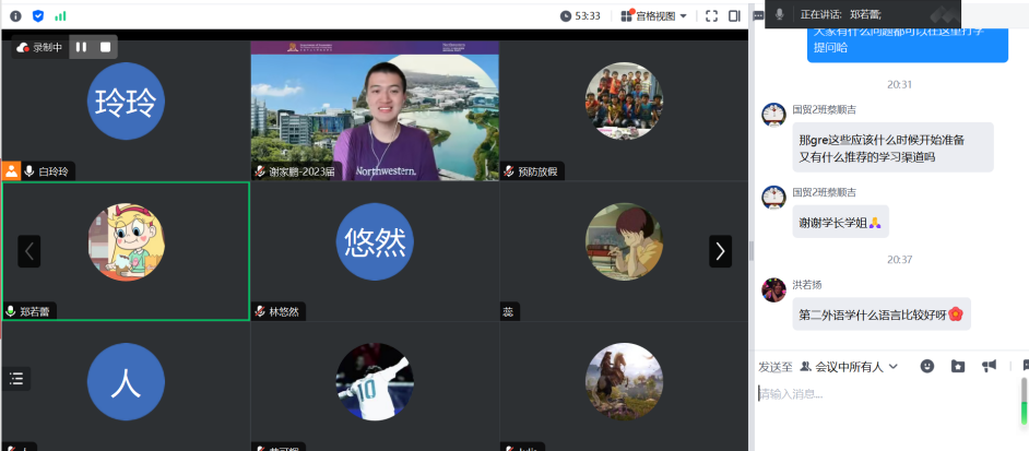 近期,公司第三十七期卓越学子交流会在线上成功举办。本次交流会的主题是“新起点·新篇章——国(境)外留学规划分享沙龙”,邀请了2019级国际经济与贸易(中外合作办学)专业谢家鹏(目前就读于美国西北大学&香港中文大学应用经济学专业)、2020级国际经济与贸易(中外合作办学)专业郑若蕾(目前就读于伦敦政治经济大学战略管理专业)两位员工分享,活动吸引了近二十位感兴趣员工参加。