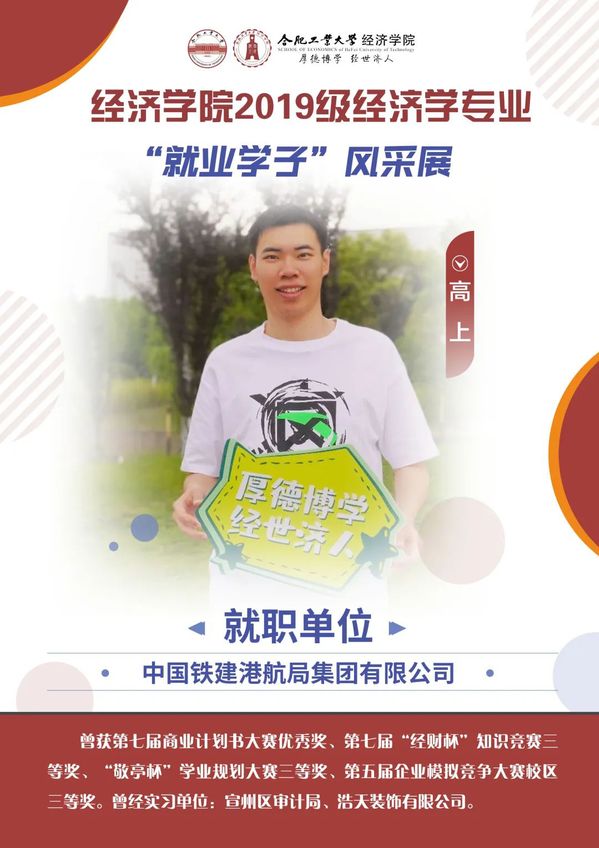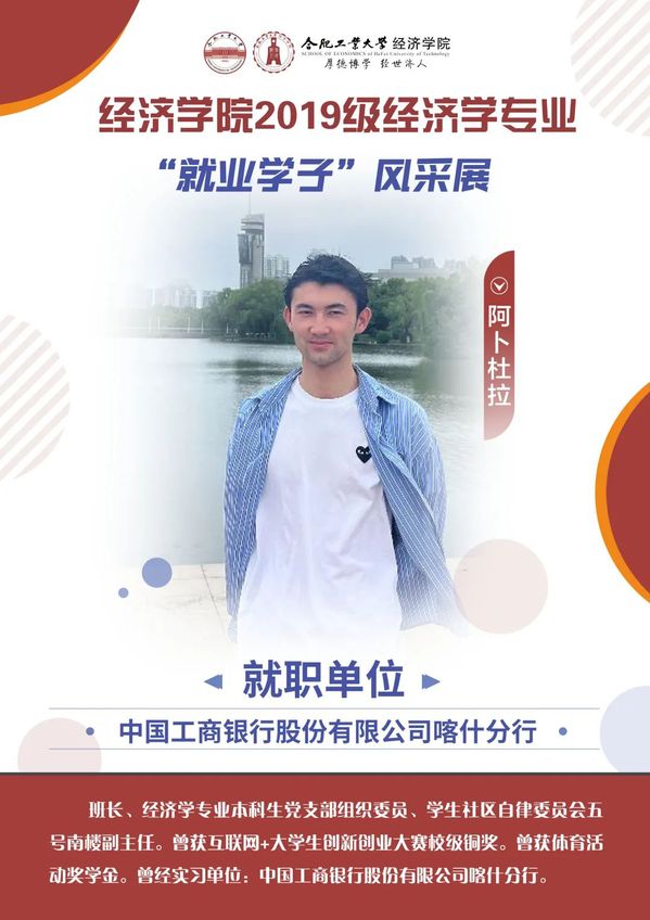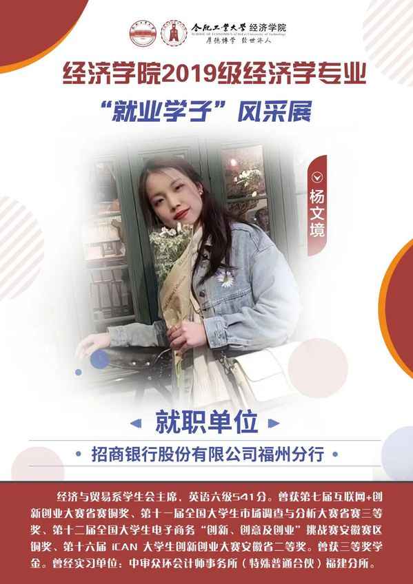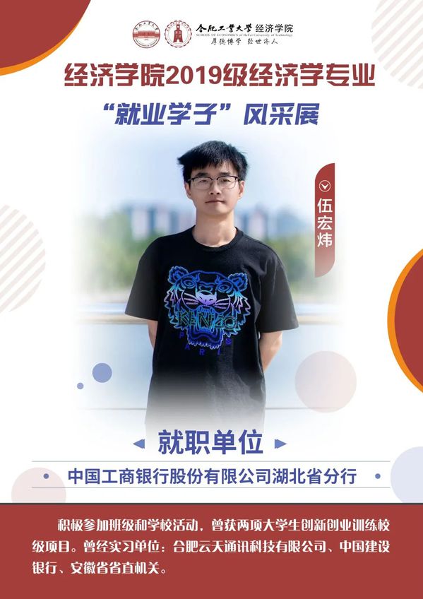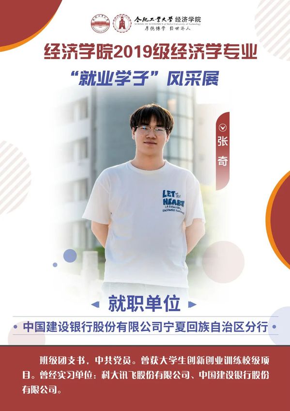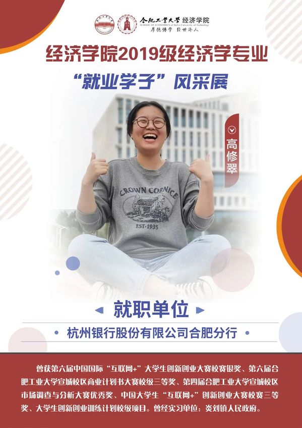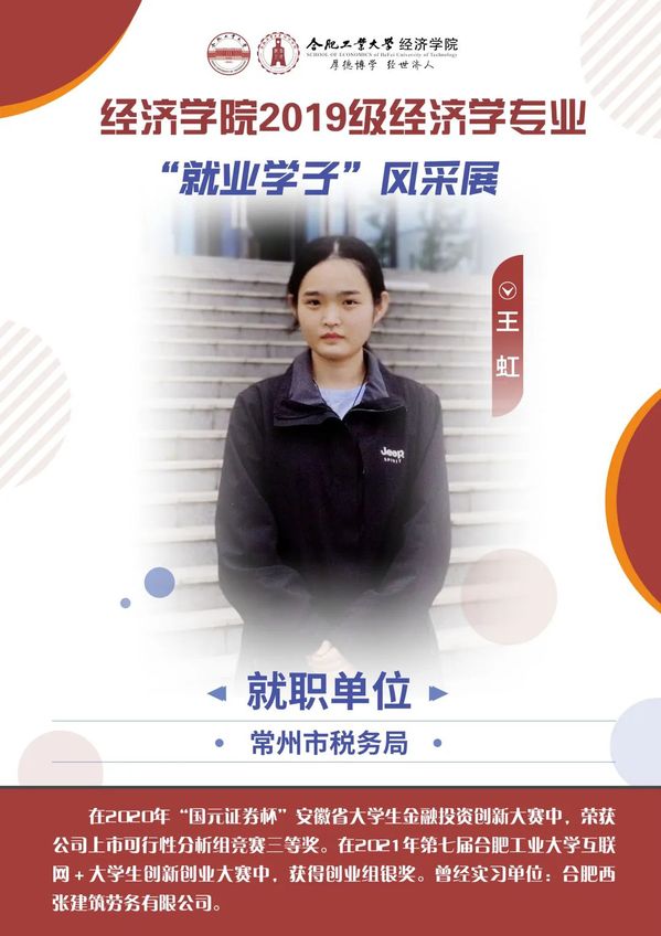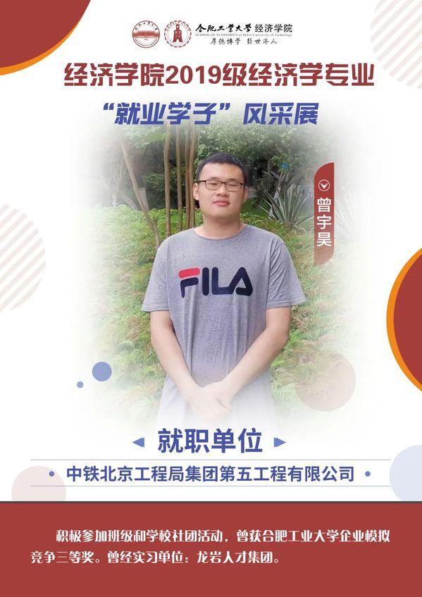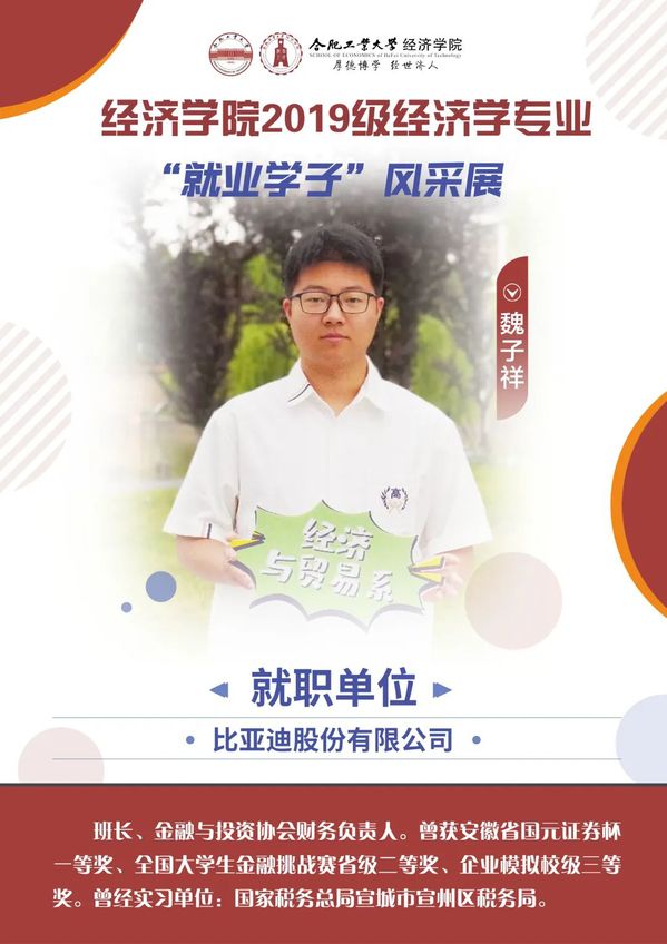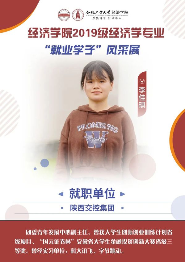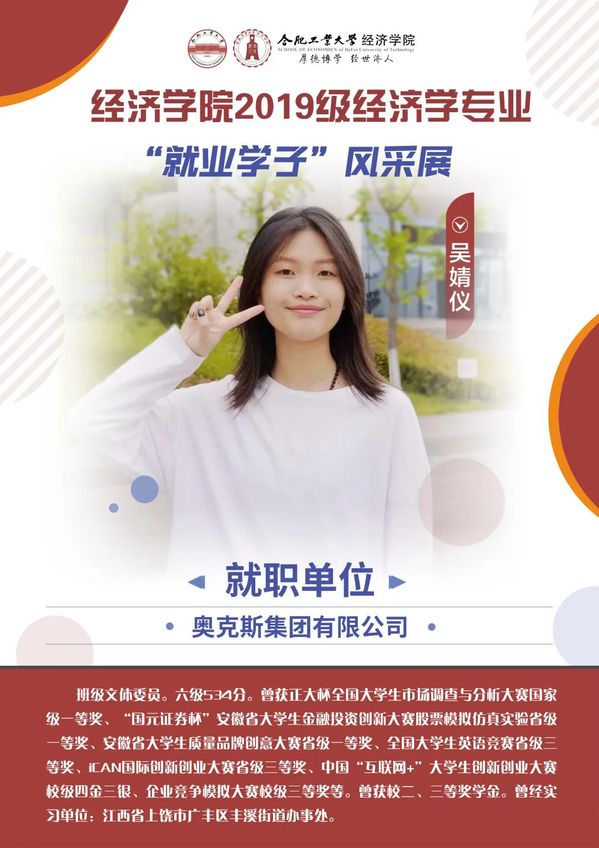 本专业2019级毕业生中,有37位同学被新加坡国立大学、澳大利亚国立大学、英国利兹大学、中国科学技术大学、中央财经大学、吉林大学、北京理工大学、山东大学、湖南大学、南京理工大学、暨南大学、西南财经大学、中南财经政法大学、西北工业大学、上海外国语大学、beet365官方网站等国内外名校录取。在就业分布中,截至目前,有46位同学(已签就业协议)被工农建中四大行、招商银行、海口海关、常州税务局、中建集团、中铁隧道集团、比亚迪、陕西交投、安徽水利等优质单位录用。本期推文带领大家领略部分经济学专业就业学子的风采。