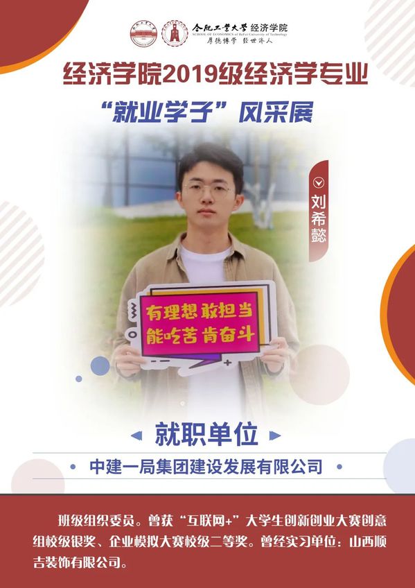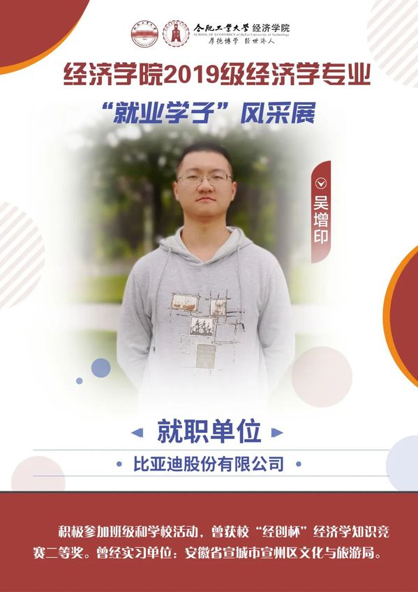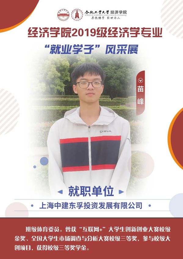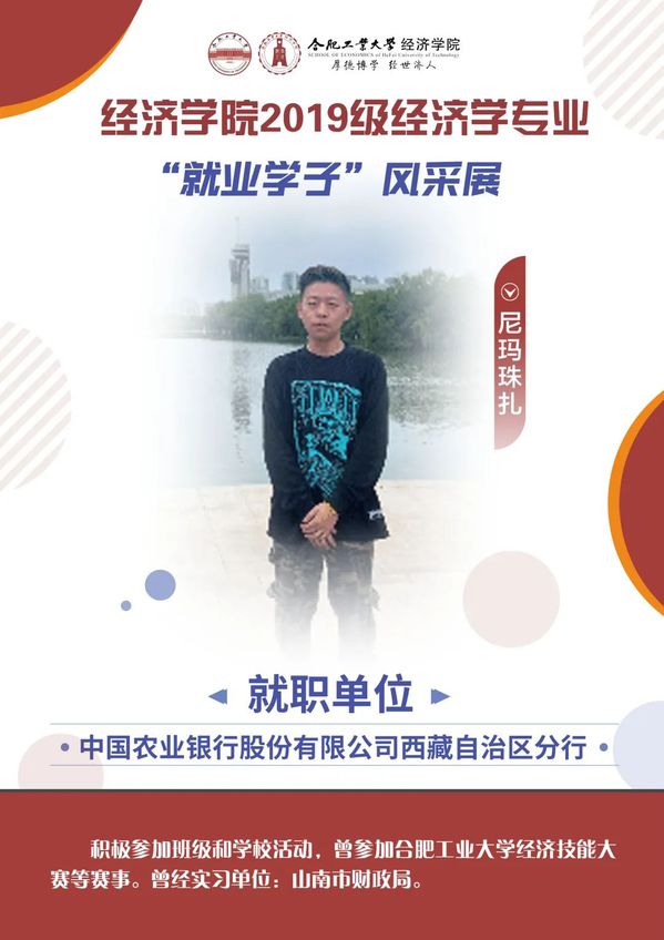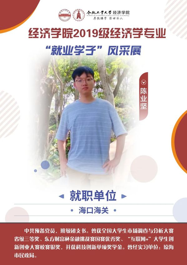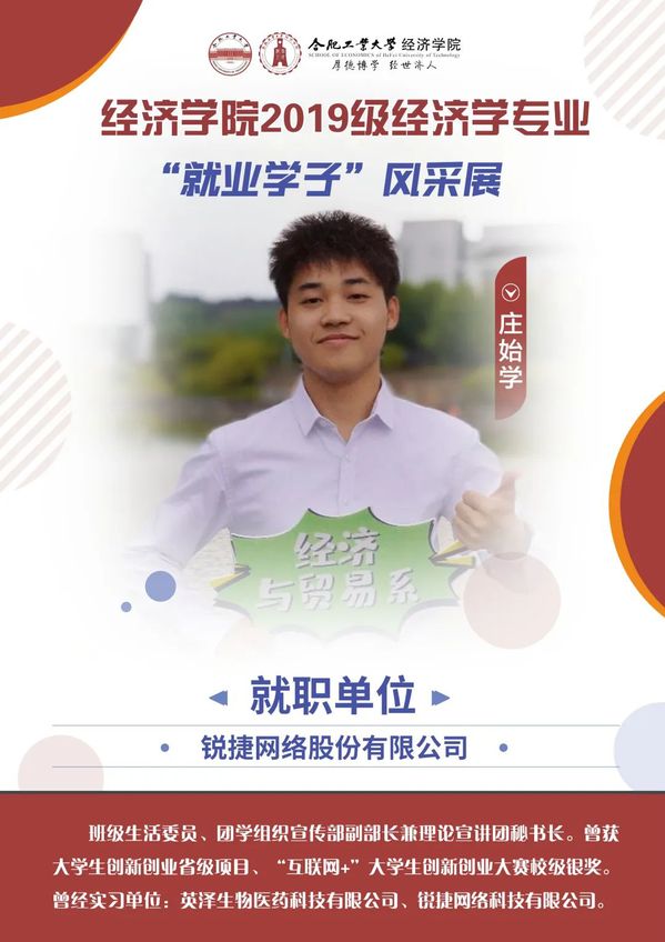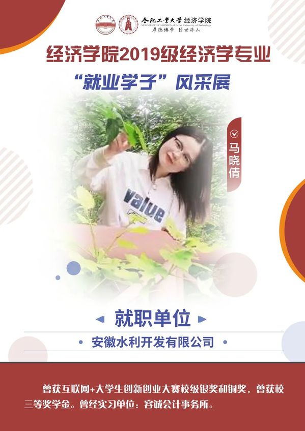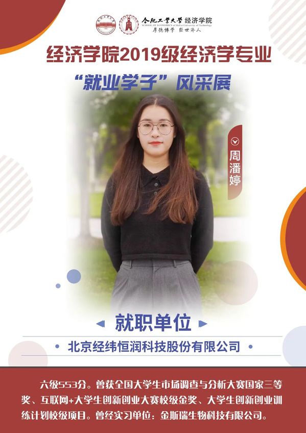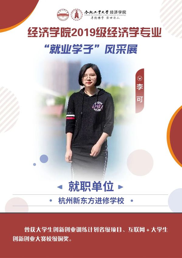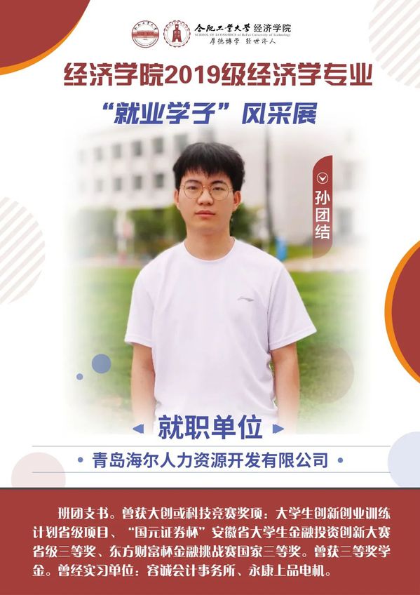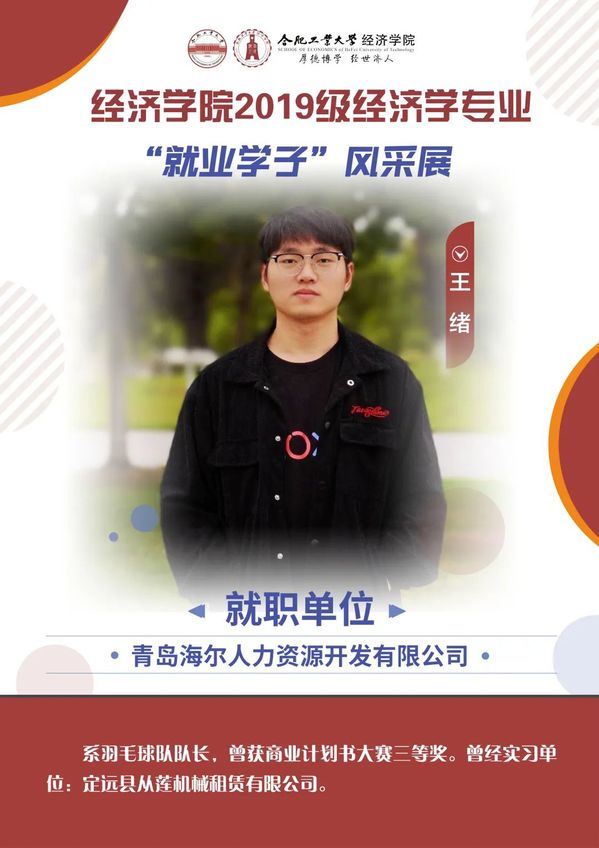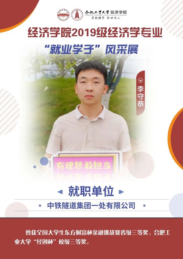 本专业2019级毕业生中,有37位同学被新加坡国立大学、澳大利亚国立大学、英国利兹大学、中国科学技术大学、中央财经大学、吉林大学、北京理工大学、山东大学、湖南大学、南京理工大学、暨南大学、西南财经大学、中南财经政法大学、西北工业大学、上海外国语大学、beet365官方网站等国内外名校录取。在就业分布中,截至目前,有46位同学(已签就业协议)被工农建中四大行、招商银行、海口海关、常州税务局、中建集团、中铁隧道集团、比亚迪、陕西交投、安徽水利等优质单位录用。本期推文带领大家领略部分经济学专业就业学子的风采。