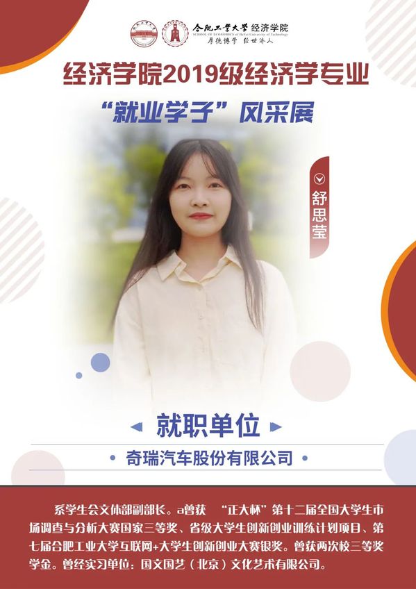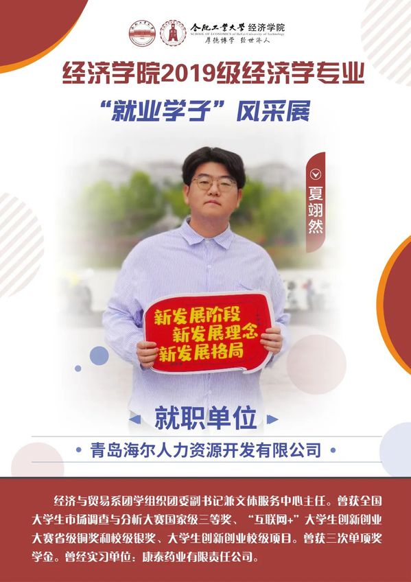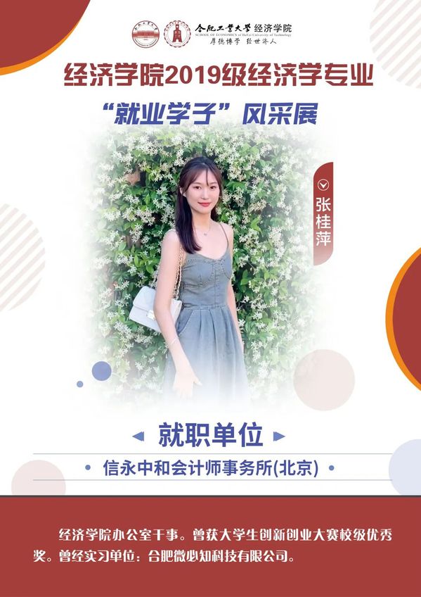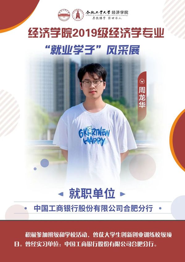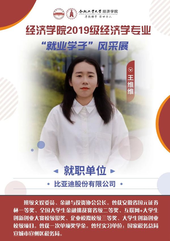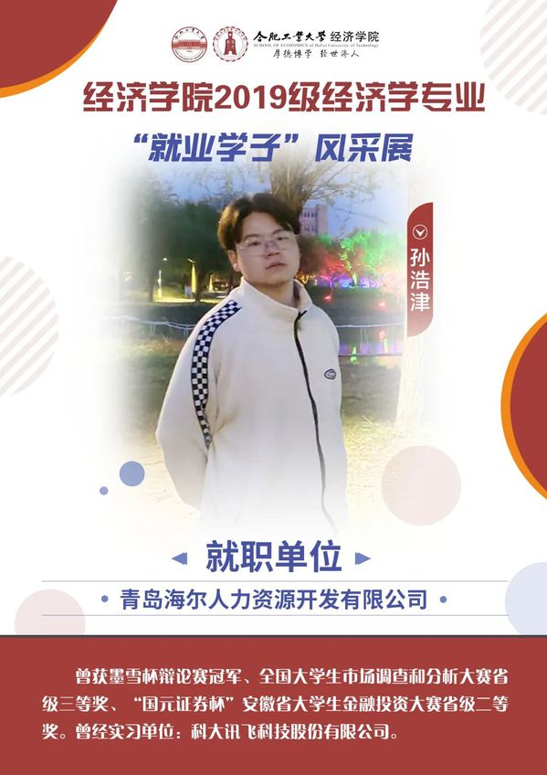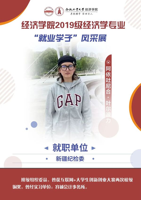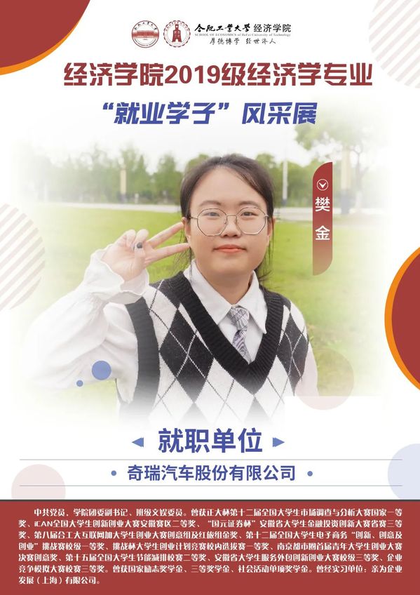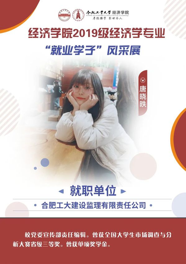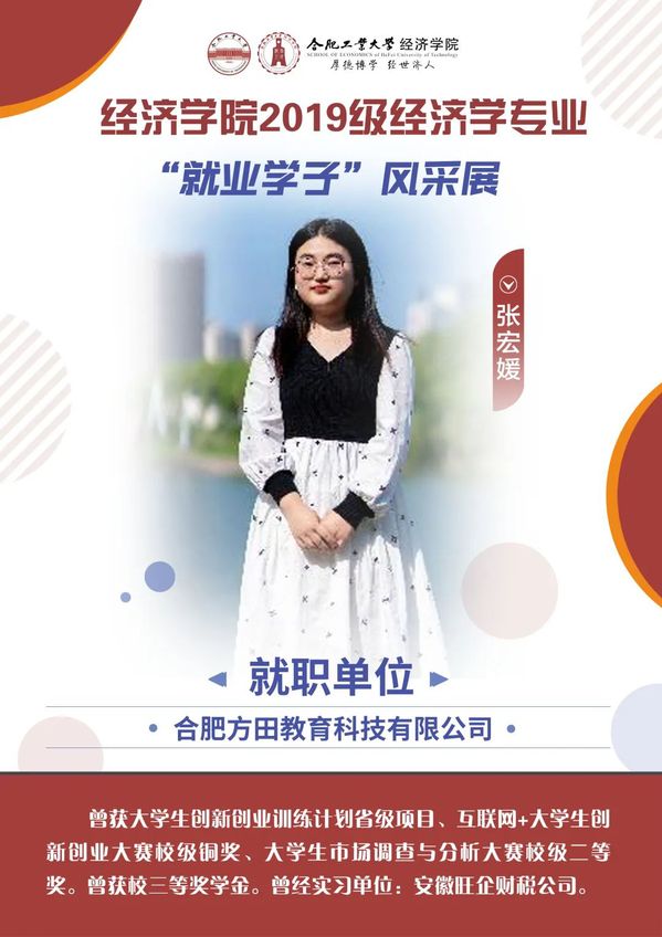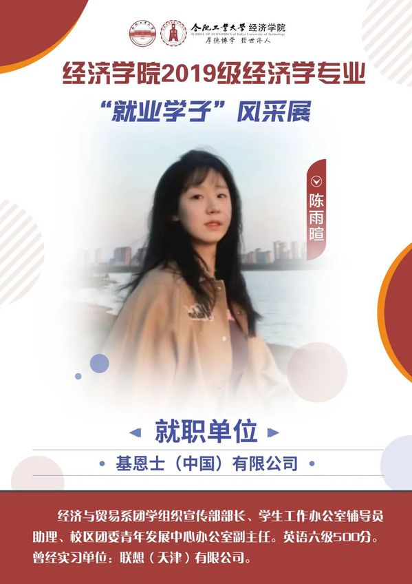 本专业2019级毕业生中,有37位同学被新加坡国立大学、澳大利亚国立大学、英国利兹大学、中国科学技术大学、中央财经大学、吉林大学、北京理工大学、山东大学、湖南大学、南京理工大学、暨南大学、西南财经大学、中南财经政法大学、西北工业大学、上海外国语大学、beet365官方网站等国内外名校录取。在就业分布中,截至目前,有46位同学(已签就业协议)被工农建中四大行、招商银行、海口海关、常州税务局、中建集团、中铁隧道集团、比亚迪、陕西交投、安徽水利等优质单位录用。本期推文带领大家领略部分经济学专业就业学子的风采。