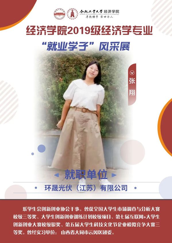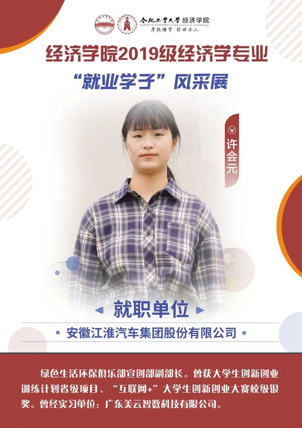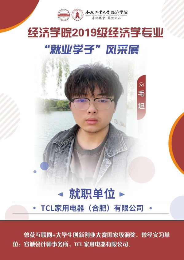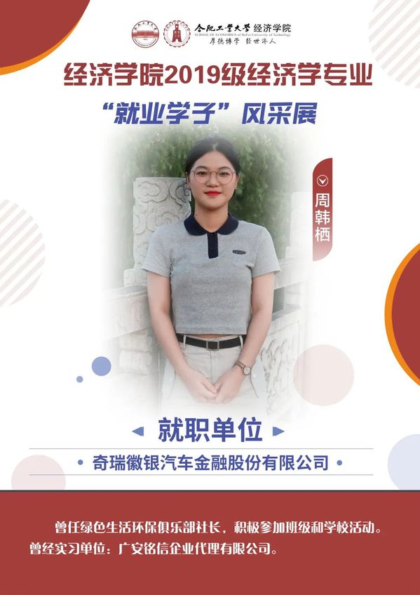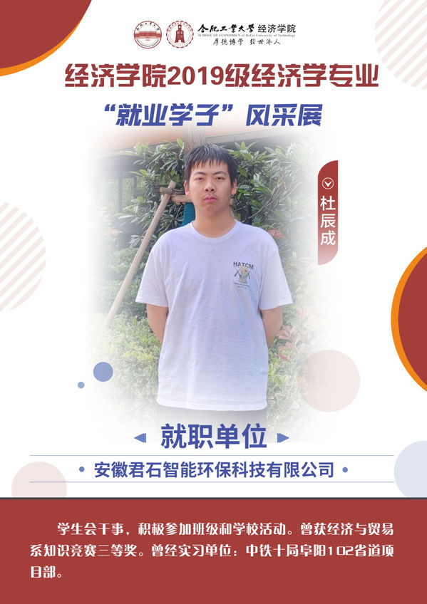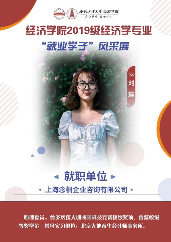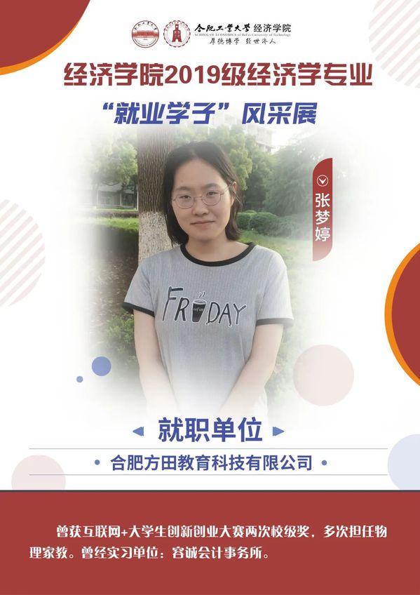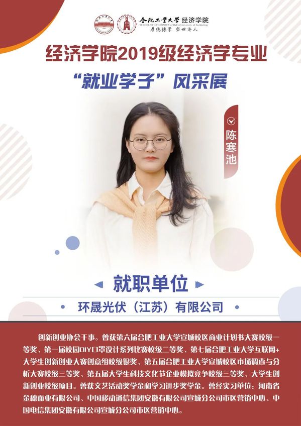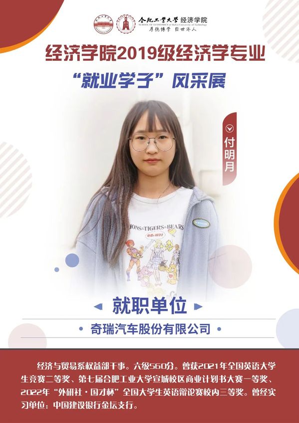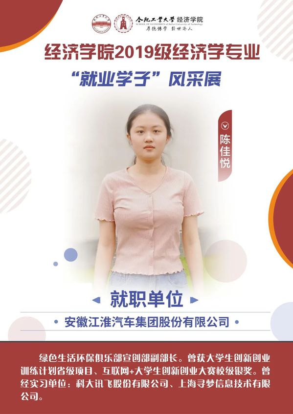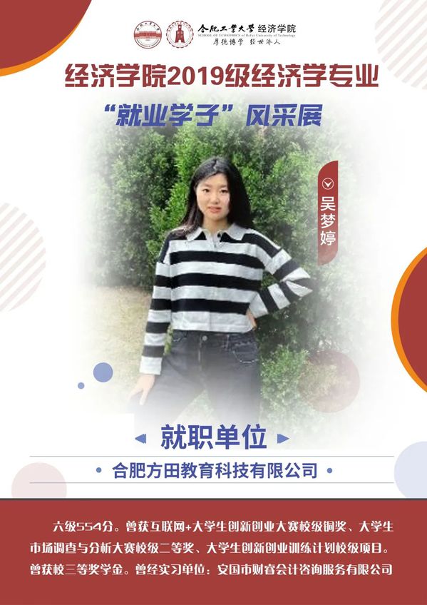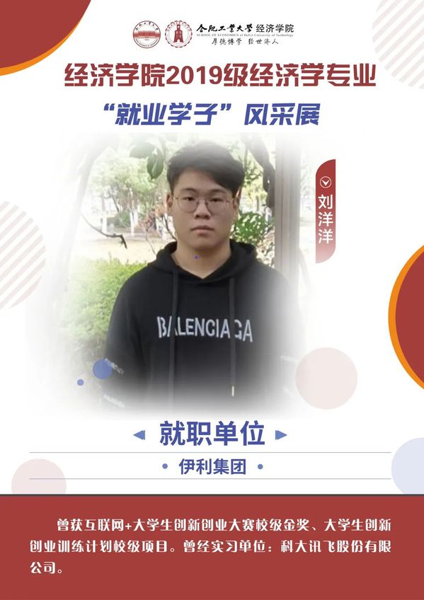 本专业2019级毕业生中,有37位同学被新加坡国立大学、澳大利亚国立大学、英国利兹大学、中国科学技术大学、中央财经大学、吉林大学、北京理工大学、山东大学、湖南大学、南京理工大学、暨南大学、西南财经大学、中南财经政法大学、西北工业大学、上海外国语大学、beet365官方网站等国内外名校录取。在就业分布中,截至目前,有46位同学(已签就业协议)被工农建中四大行、招商银行、海口海关、常州税务局、中建集团、中铁隧道集团、比亚迪、陕西交投、安徽水利等优质单位录用。本期推文带领大家领略部分经济学专业就业学子的风采。