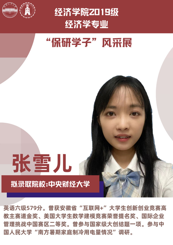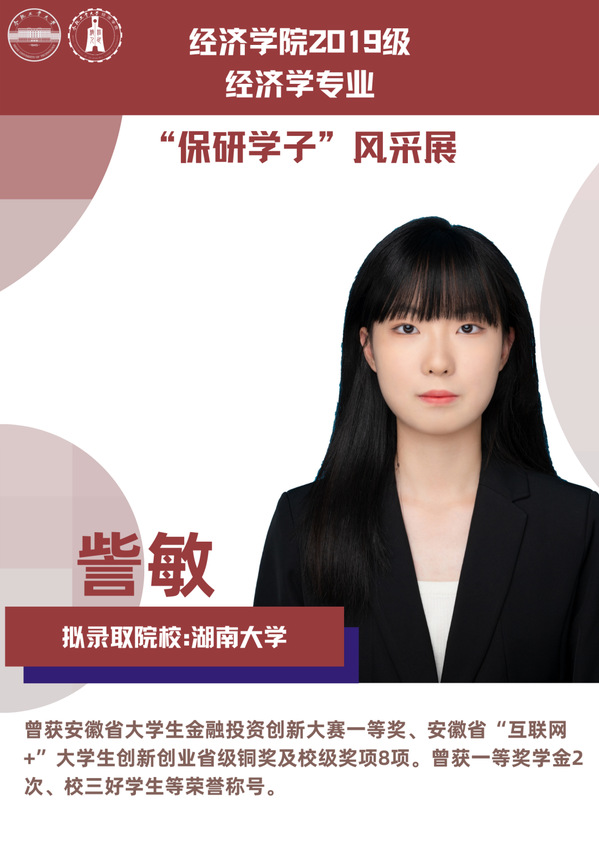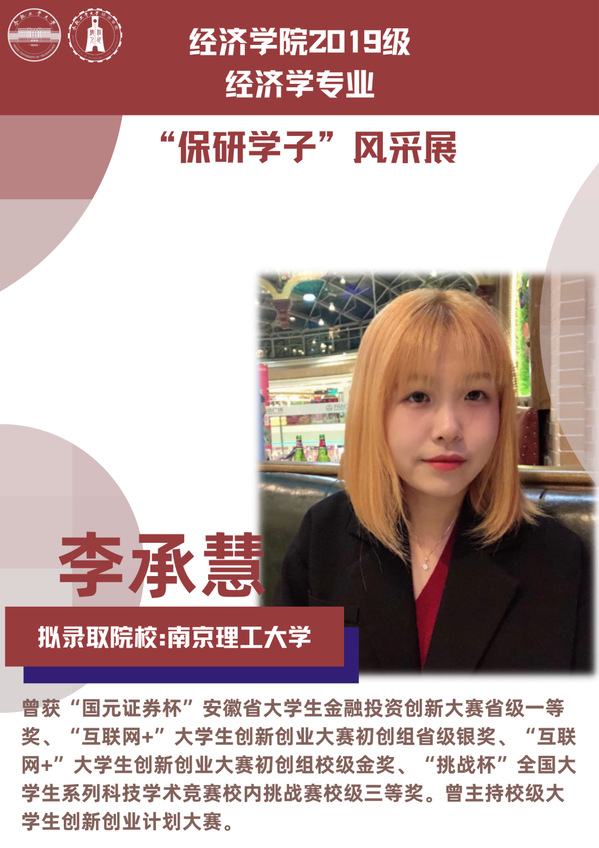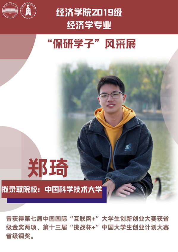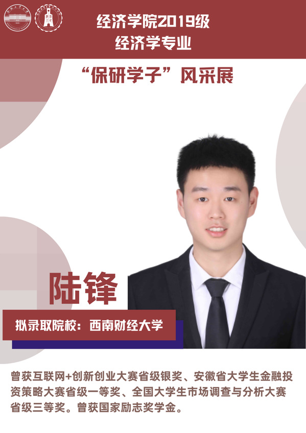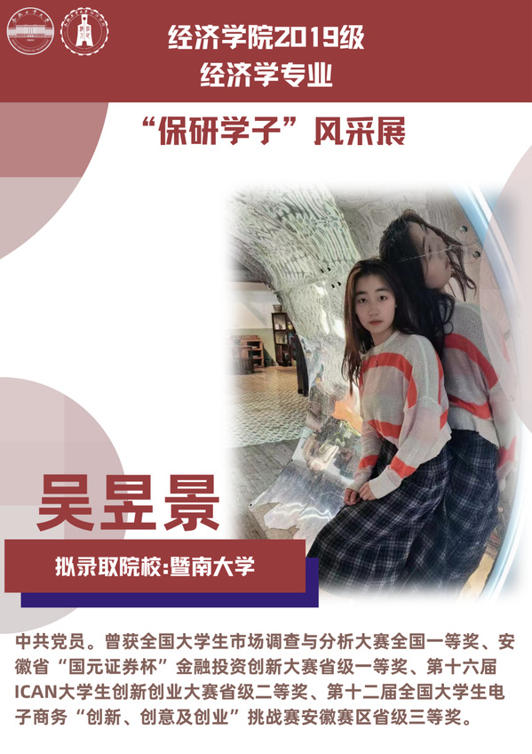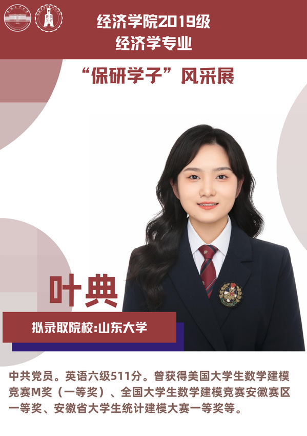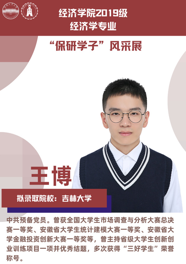 beet365官方网站经济学专业前身为贸易经济专业,1999年更名为经济学专业,2012年宣城校区同步招生。2021年中央赛道评审中,获批“省级一流本科专业建设点”。同年与美国克拉克大学本硕博贯通式联合培养机制正式落地。本专业顺应人工智能、数字经济与新经济的时代要求,以“经济分析与数字治理”为特色方向,培养能够熟练应用现代经济分析工具和数字经济理论及技术,为政府、企事业部门提供经济分析、预测与治理的新文科高素质专业人才。2019级经济学专业员工中,19名推免生被中国科学技术大学、中央财经大学、吉林大学、北京理工大学等国内名校拟录取。本期推文将带领大家共同领略2019级经济学专业“保研学子”的风采。