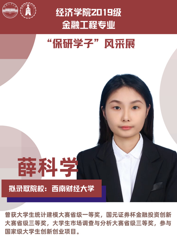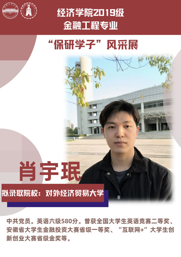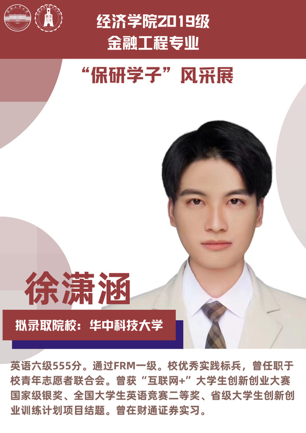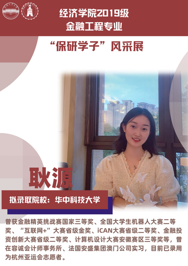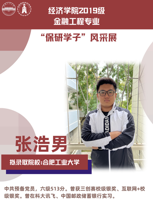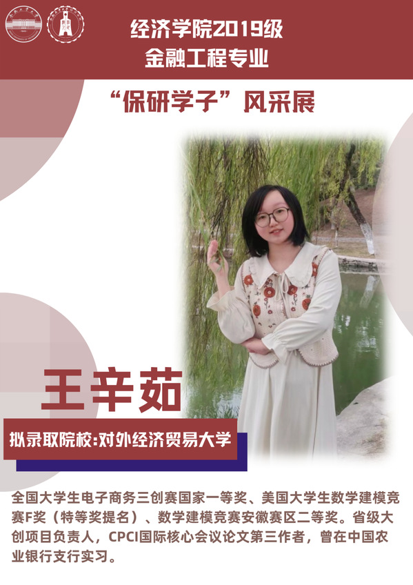 beet365官方网站金融工程专业2019年入选首批“国家级一流本科专业建设点”,2021年“软科中国大学专业排名”中被评为A类专业(位列全国第27位),本专业以“金融科技与大数据”为人才培养特色。2019级金融工程专业员工中,14名推免生被中国科学技术大学、华中科技大学、天津大学、上海财经大学、对外经济贸易大学、西南财经大学等国内名校拟录取。本期推文将带领大家共同领略2019级金融工程专业“保研学子”的风采。