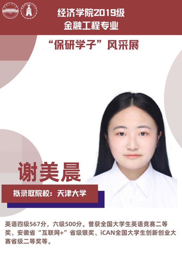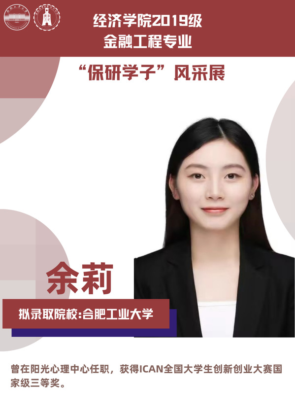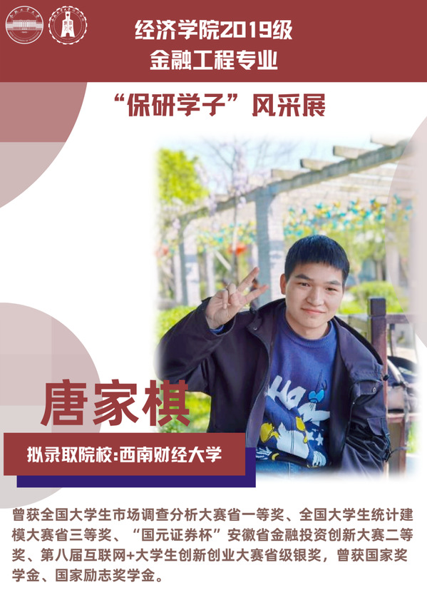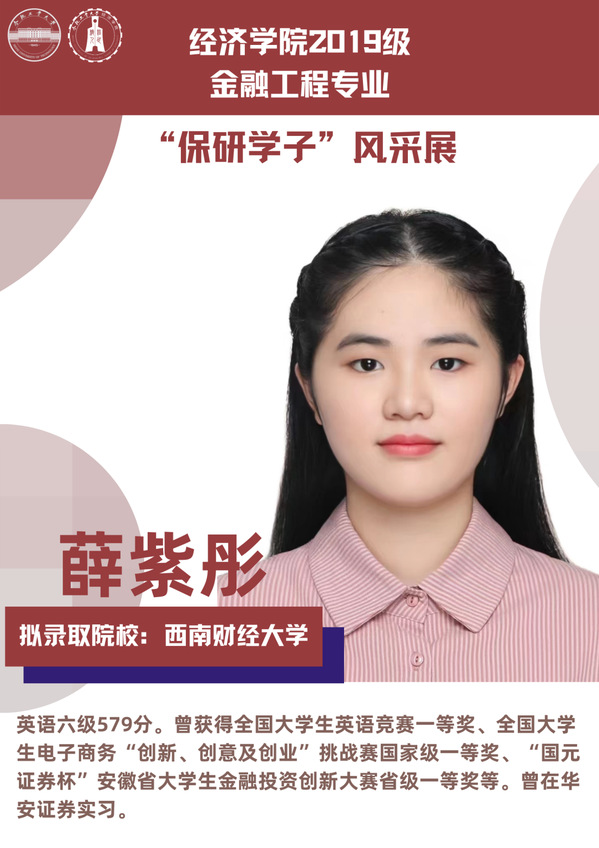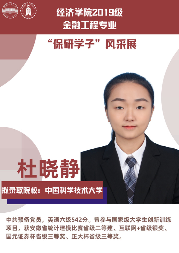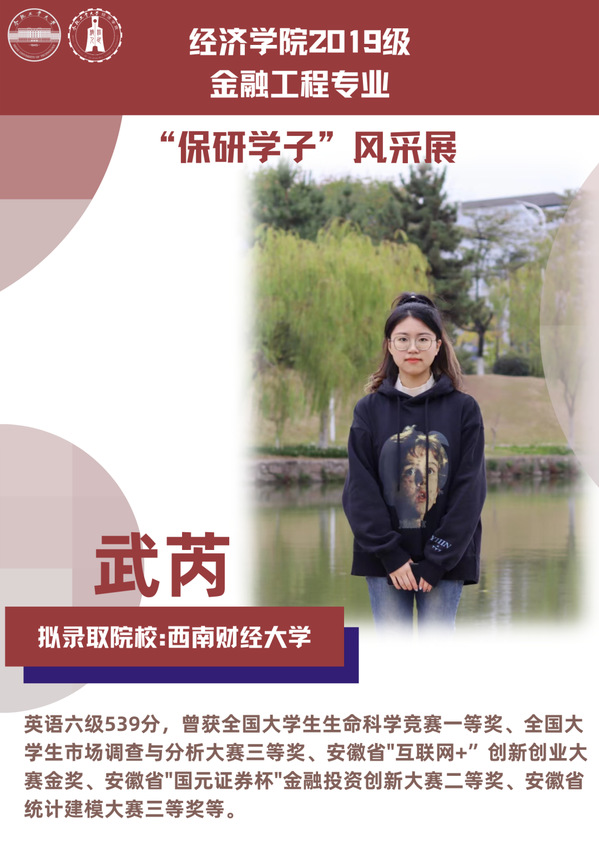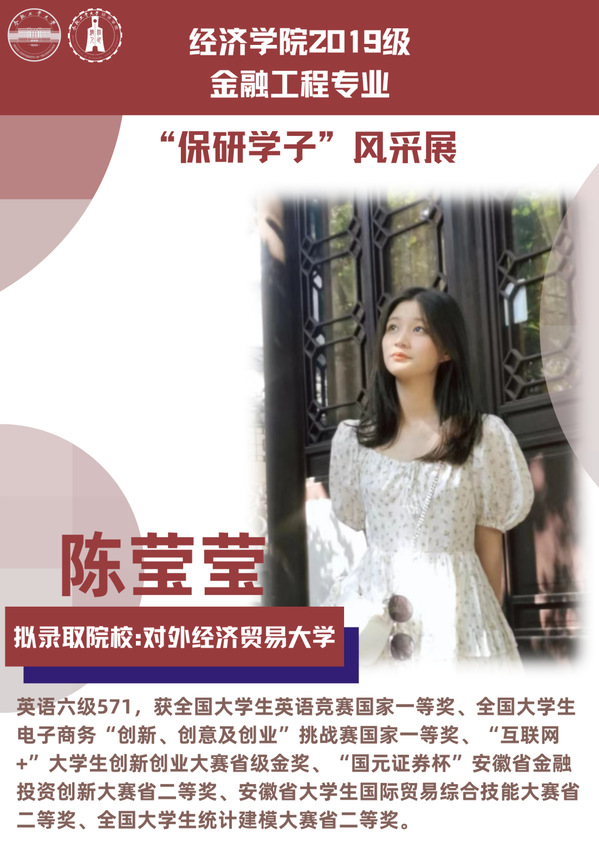 beet365官方网站金融工程专业2019年入选首批“国家级一流本科专业建设点”,2021年“软科中国大学专业排名”中被评为A类专业(位列全国第27位),本专业以“金融科技与大数据”为人才培养特色。2019级金融工程专业员工中,14名推免生被中国科学技术大学、华中科技大学、天津大学、上海财经大学、对外经济贸易大学、西南财经大学等国内名校拟录取。本期推文将带领大家共同领略2019级金融工程专业“保研学子”的风采。
