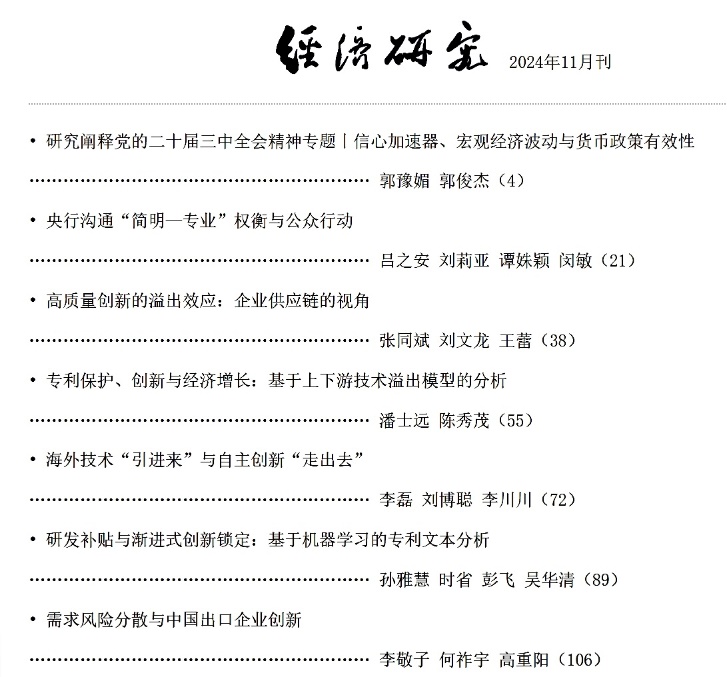近日,公司孙雅慧老师为第一作者的论文《研发补贴与渐进式创新锁定:基于机器学习的专利文本分析》在《经济研究》2024年第11期发表(通讯作者:时省;合作者:彭飞、吴华清)。本论文得到国家社会科学基金重大项目(18ZDA064)、国家自然科学基金青年项目(72004052)、国家自然科学基金面上项目(72273038)、教育部人文社会科学研究青年基金项目(24YJC790156)和安徽省自然科学基金青年项目(2408085QG219)的资助。《经济研究》由中国社会科公司经济研究所主办,是综合性经济理论类权威期刊,致力于发表关于中国特色社会主义经济建设事业中重大现实问题的高水平理论研究类文章,2023年的复合影响因子为20.288。