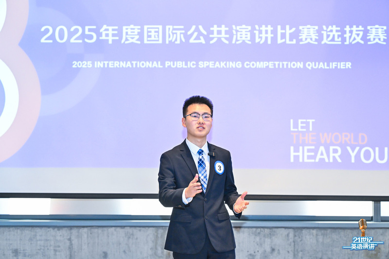 陈安熠同学于2024年10月在第29届中国日报社“21世纪杯”全国英语演讲比赛总决赛中获得全国一等奖,之后顺利入围2025年国际公共演讲比赛选拔赛的选拔。本次选拔赛赛制严格,竞争激烈陈安熠同学克服了时间紧、任务重带来的种种困难,在指导老师的悉心指导下,夜以继日地打磨演讲稿,反复练习演讲技巧,最终凭借扎实的语言功底、敏锐的思维反应出色的临场发挥和稳定的心理素质征服了评委和观众,成功锁定两个代表中国参赛的席位之一,展现了中国Z世代青年学子的卓越风采。