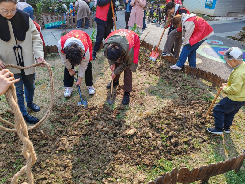 活动以童趣盎然的亲子互动开场。志愿者引导孩子们蘸取彩泥,用掌印绘制“手掌花”,记录温馨瞬间;另一组志愿者则挥锹整地、架设围栏,为种植筑牢基础。植树区内,8组家庭在志愿者帮助下扶苗培土、浇水挂牌,孩子们踮脚为树苗挂上认养证书;花园区域,4组家庭协同志愿者栽种花苗、系上心愿卡,稚嫩笔迹写满对绿色的憧憬。三小时齐心协作后,20余株新绿扎根社区,花园焕发蓬勃生机。一位家长感慨:“孩子亲手种下树苗,更懂得了敬畏自然的意义。”