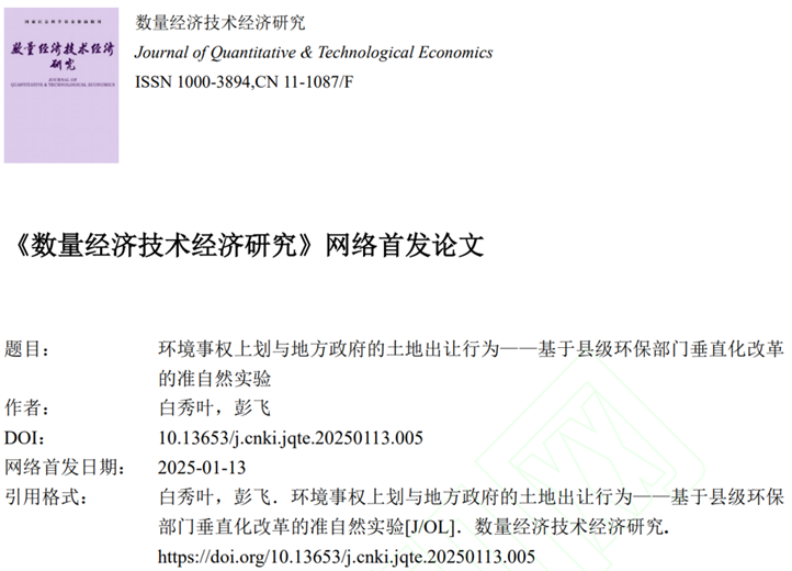 白秀叶老师与2021级经济学本科生朱宇(保研至北京师范大学),在《制度经济学研究》发表论文《“压力型”财政激励与县域城市扩张——来自取消农业税改革的准自然实验》(2024年9月,合作者:刘清春,詹铭峰)。该文以2006年全国取消农业税作为地方政府财政压力变化的准自然实验,运用强度双重差分法实证检验地方政府的财政压力对县域城市扩张的影响,对于经济高质量发展阶段推进以县城为载体的新型城镇化建设具有借鉴意义。同时,白秀叶老师近期在《数量经济技术经济研究》在线发表论文《环境事权上划与地方政府的土地出让行为——基于县级环保部门垂直化改革的准自然实验》(2025年1月录用,合作者:彭飞)。该文以2016年中央自上而下推动的省以下环保部门垂直化改革作为准自然实验,创新性地使用县级环保部门挂牌与微观地块出让数据探究环境事权上划对地方政府土地出让行为的影响效应及作用机制。