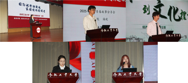 “青春榜样”故事分享会中,来自国际经济与贸易21级3班的彭思雨晨、金融工程22级1班的汤欢、国际经济与贸易22级3班的宋士哲、经济学22级1班的古丽则巴、应用经济学学硕055班的蒋雨欣五位同学分别从“五四红旗团支部”建设、“学术科研”、“科技创新”、“素质提升”、“基层服务”方面分享了他们的青春故事。