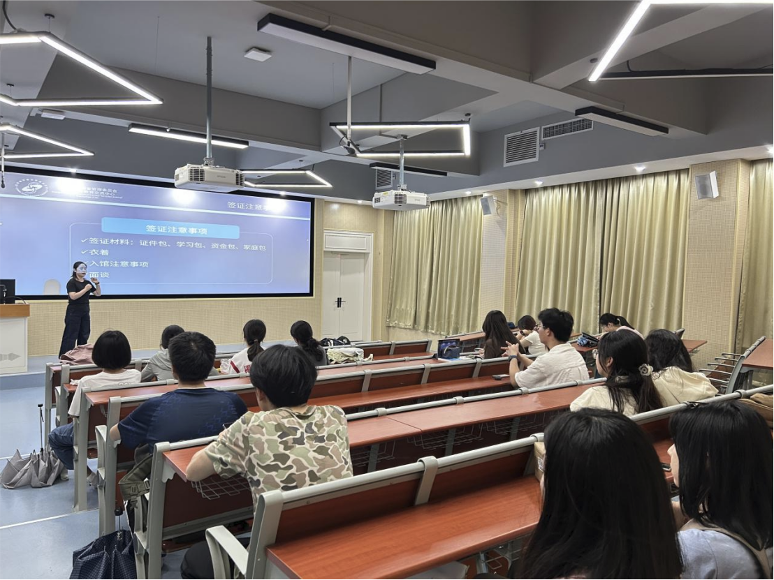 会上,朱瑞玲老师围绕留学政策、签证办理、行前准备、入境流程、校园生活、安全意识与风险防范、法律援助等方面展开系统讲解,通过案例分析提供实用策略。参会师生认真聆听,并就面签材料准备、出入境手续关键问题进行深入交流。