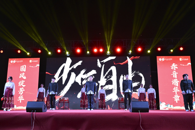 聘任仪式后,国风音乐节启幕。晚会以“国风”为韵、“青春”为律,分三篇章展开。舞蹈《霓裳彩韵》《采薇》演绎东方美学;歌曲《赤伶》《如果没有李白》以声传情,抒家国情怀与文人风骨;反诈话剧《反诈联盟》寓教于乐,传递防范意识;《有我》献礼校庆80周年,唱响传承担当。整场演出传统与现代交织,气氛热烈,高潮迭起,为观众打造了一场难忘的国风艺术盛宴。
