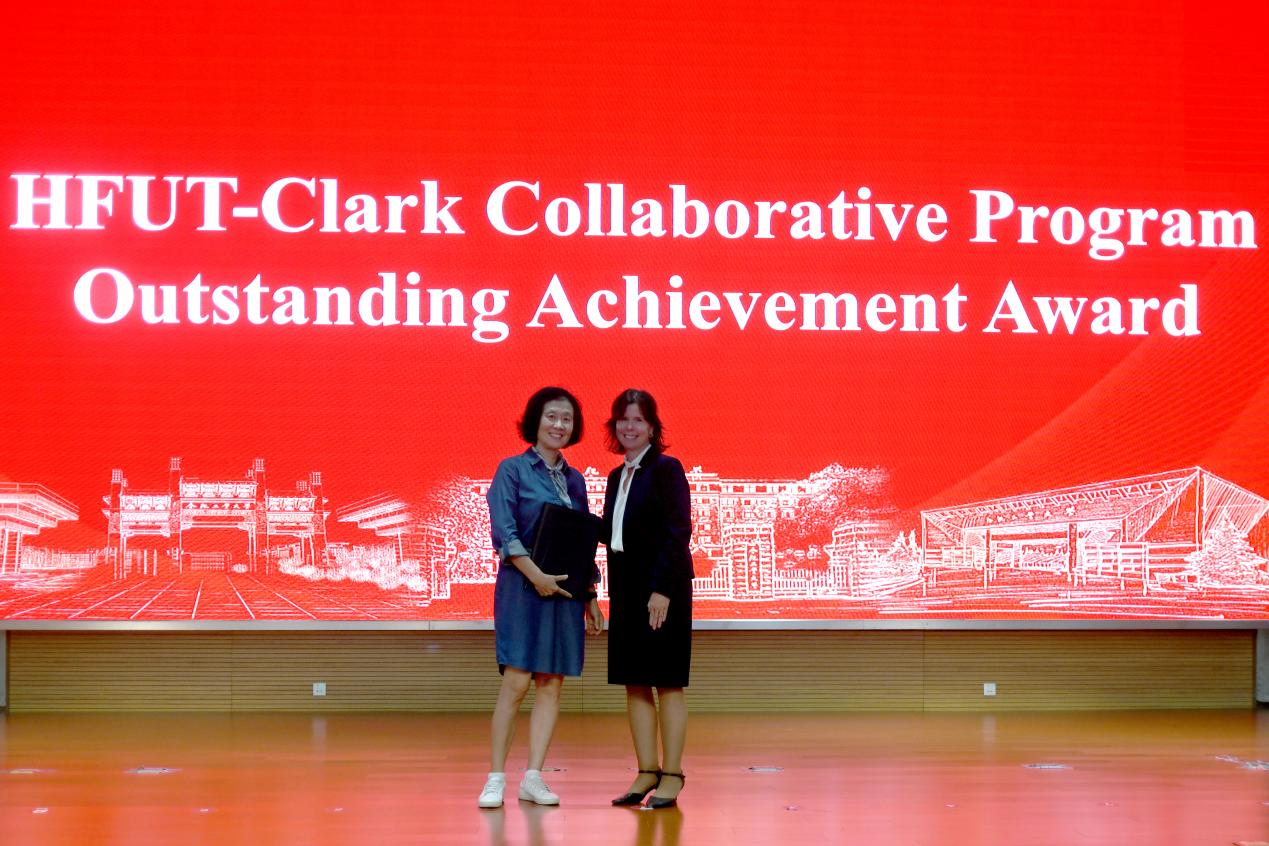 最后,Jennifer Hanselman和张炳武共同为参加2025年克拉克大学暑校项目的员工颁发证书。Jennifer Hanselman为克拉克大学外籍教师Yingjuan Rogers颁发“十周年外教杰出贡献奖”。